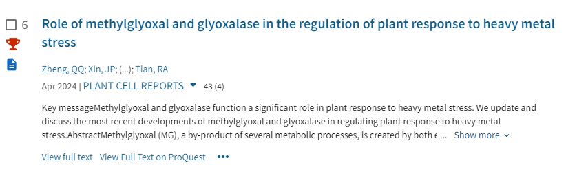 该综述于2024年3月19日发表在JCR一区、中科院大类二区期刊 Plant Cell Reports(影响因子5.3),系统梳理了甲基乙二醛(MG)及其解毒系统——乙二醛酶(GLY)在植物应对重金属胁迫过程中的调控机制。