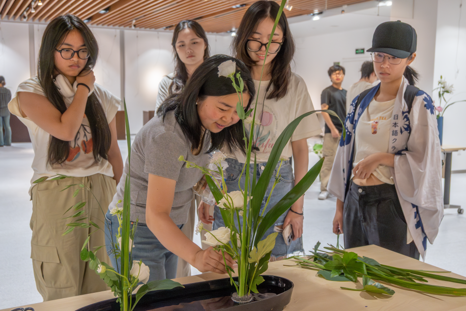 活动现场,同学们小组合作,完成了从设计构思、材料准备、整形摆插再到现场布展的全过程,过程中文书生老师亲手示范如何修剪花枝、调整角度和固定花材等。在老师的悉心指导下,创作者们将自然之真、艺术之美和人文之韵完美结合,在方寸盆间打造出专属于自己的"清幽之境"。很快,一件件精美的作品便填满了展厅,有的作品以简洁的线条勾勒出夏日的静谧,有的则通过丰富的色彩搭配展现出夏至时节的生机与活力,作品吸引众多师生驻足观赏、拍照留念。