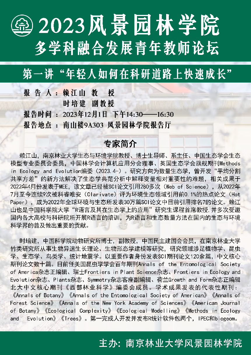 2023年12月1日下午,大学生 生态与环境学院赖江山教授、竹类研究所时培建副教教授应邀参加我院举办的多学科融合发展青年教师论坛,为我院师生做题为“年轻人如何在科研道路上快速成长”的主题报告,与老师同学们进行相关研究经验交流分享。主题报告由曹加杰副院长主持,我院硕士和博士研究生尽数到场参加交流。