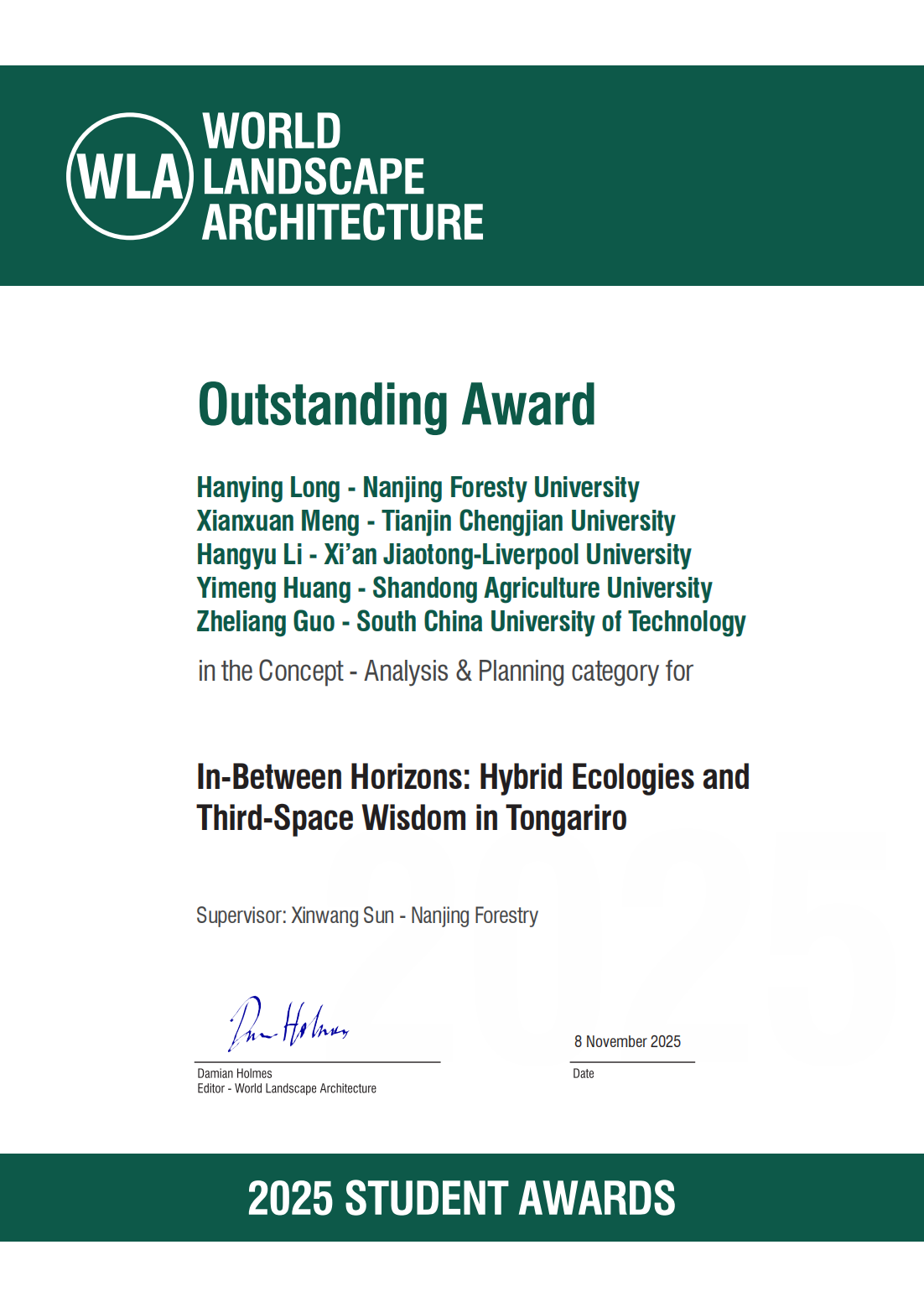 此次获奖不仅展示了我院学生在国际舞台上的创新能力与专业素养,也充分体现了学院在景观规划与设计教育领域的教学成果。我院将继续致力于培养具备全球视野与社会责任的高素质景观人才,鼓励师生在更广阔的平台上交流切磋、再创佳绩。