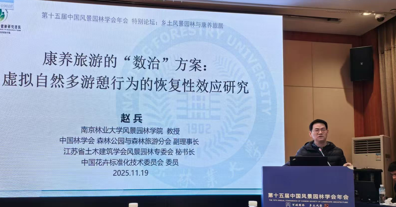 11月19日下午,在“乡土风景园林与康养旅居”特别论坛中,赵兵教授以《康养旅游的“数治”方案:虚拟自然多游憩行为的恢复性效应研究》为题作报告。针对现实康养旅游在年龄、身体、时间等方面存在的推广壁垒,提出了数字康养旅游能否复现真实康旅恢复性效应的关键科学问题,并系统解析了影响其“疗效”复现的关键因素,为康养旅游的数字化拓展提供了理论依据与实践参考。